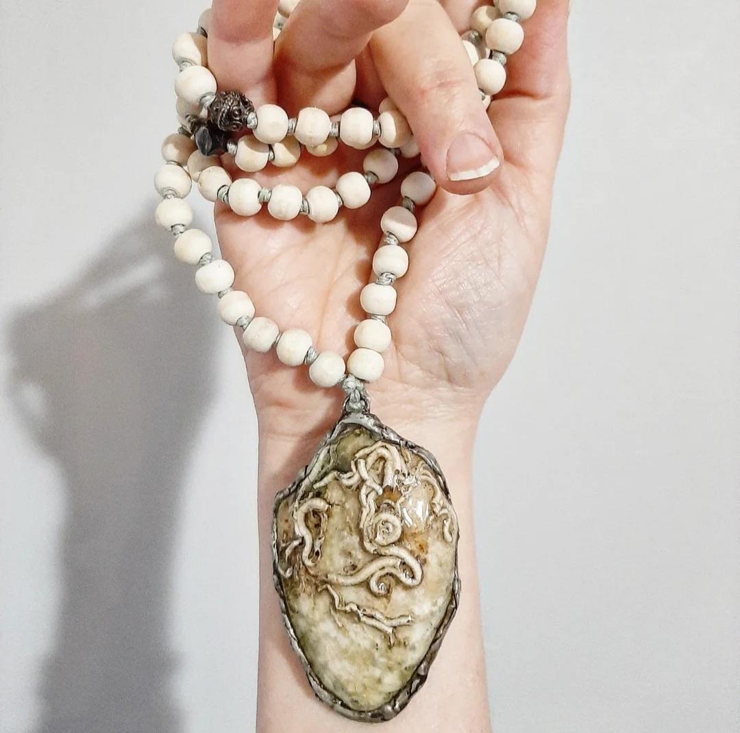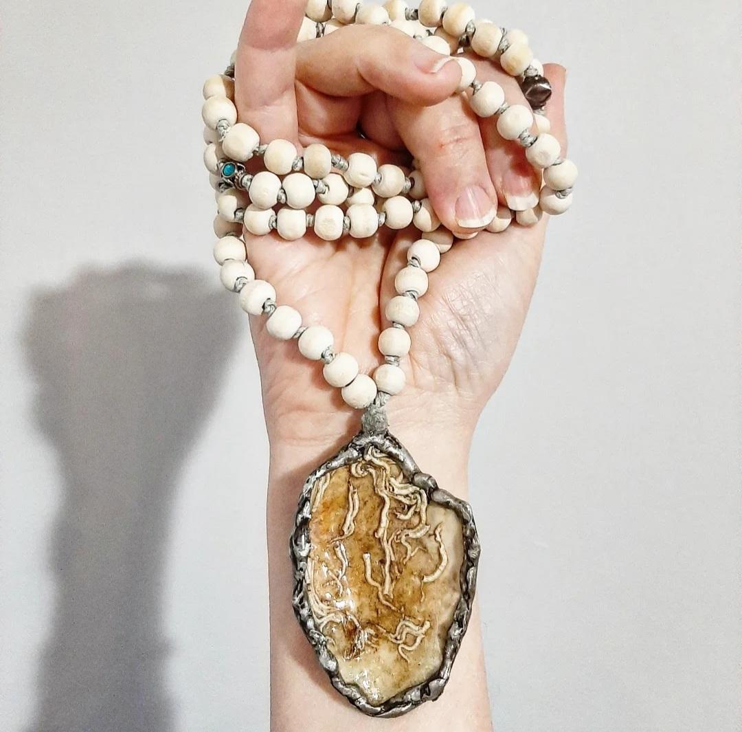 Neem, Bali bead, vintage silver, seashell wrapped in silver and sealed with resin.